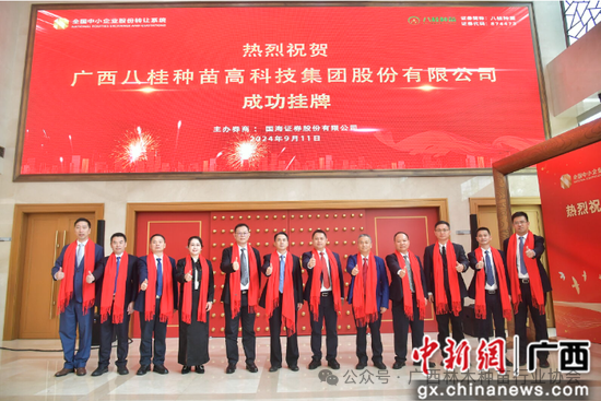挂牌仪式上,广西林业局总工程师施福军对八桂种苗集团成功挂牌新三板表示祝贺。他表示,近年来,在自治区党委、政府的正确领导下,广西各级林业部门把发展壮大现代林业产业、建设现代林业强区作为重大战略,深入实施万亿林业产业三年行动,全力加快建设现代林业产业强区,并结合林业行业特点以及企业自身优势,对广西八桂种苗集团等林业重点龙头企业给予大力支持,推动优质企业上市。广西八桂种苗集团成功挂牌新三板,是广西八桂种苗集团发展历程中的一个重要里程碑,也是广西林业产业转型升级、资本市场助力绿色发展的一个生动实践,同时也标志着广西林木种业迈入了新的历史阶段。他希望广西八桂种苗集团继续秉持绿色发展理念,勇于创新,为林业高质量发展作出更大的贡献。南宁高新技术产业开发区党工委委员、管委会常务副主任黄奕信充分肯定了广西八桂种苗集团在科技创新、品牌建设、市场布局优化和市场竞争力提升等方面取得的成就。他希望广西八桂种苗集团再接再厉,继续深化科技研发,加强成果转化,大力发展新质生产力,推动企业做大做强,为南宁高新区和南宁市的经济增长注入更多创新活力和市场竞争力,共同推动区域经济的持续健康发展。